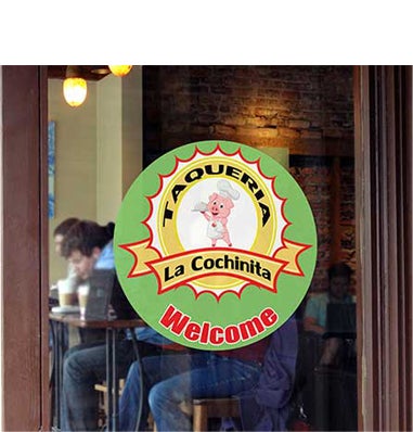 Window decals come in paper (left) and vinyl (right). Decals are pre-glued, and are great for a more permanent display.